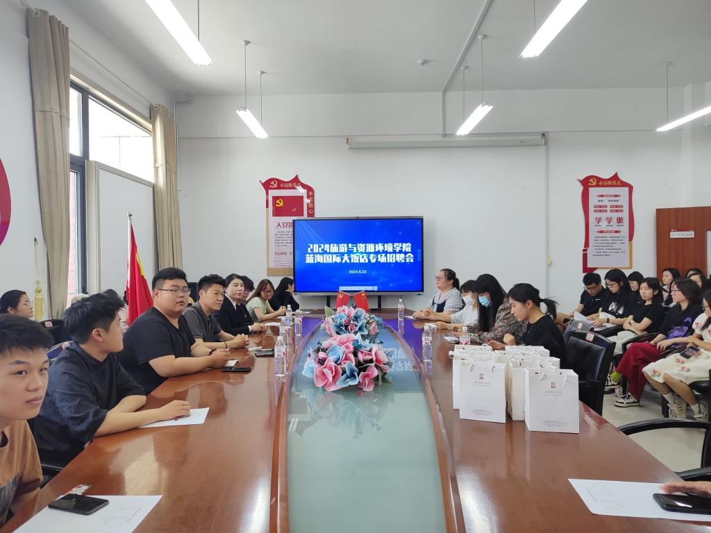 5月23日,申博sunbet在豁然楼A415成功举办蓝海国际大酒店毕业实习专场招聘会。本次会议由辅导员翟国琳主持,2020级酒店管理、旅游管理专业毕业生参加。