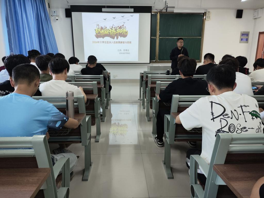 宣讲会上,范增良分别从入伍的基本条件、流程、入伍所享受的优惠政策等方面向同学们解读当前的老员工征兵政策。此外,范增良还针对同学们普遍关心的入伍条件、服役期限、军旅生涯规划以及退役后的安置等问题进行了细致解答,帮助同学们全面了解参军的意义和未来可能发展的道路。会上,范增良呼吁同学们积极响应国家征召,选择参军入伍,以实际行动捍卫国家安全,同时也借此机会实现个人价值追求,为国家的繁荣稳定贡献自己的青春力量。