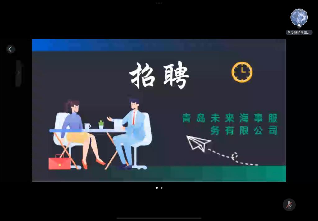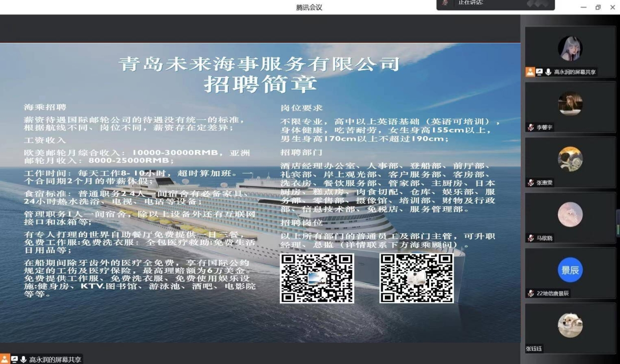 4月17日,申博sunbet与青岛未来海事服务有限公司通过线上平台成功举办海事工作招聘宣讲会。此次宣讲会由青岛未来海事服务有限公司吕良主讲,20级国际旅游、酒店管理专业全体员工参与。
