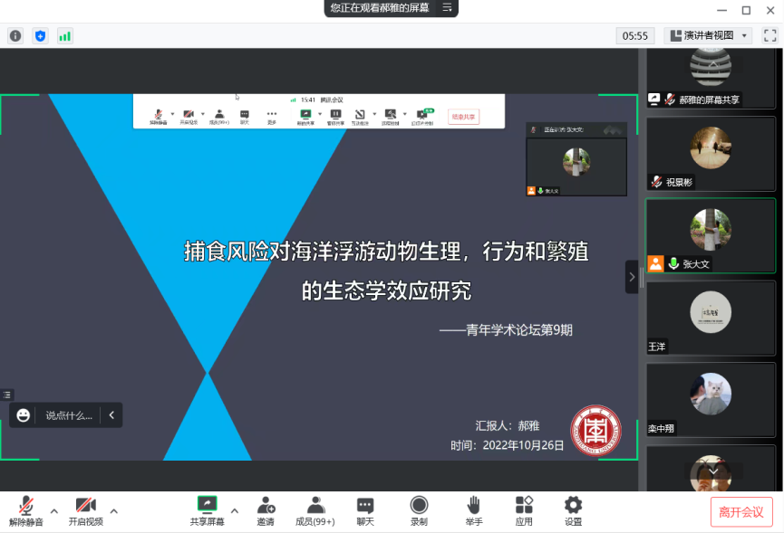 报告会上,郝雅博士做了“捕食风险对海洋桡足类生理,行为和繁殖的生态学效应研究”的学术报告,介绍了海洋经典食物网内捕食风险的生态效应研究现状,以海洋生态学模式生物安氏伪镖水蚤和海水青鳉鱼构建了捕食关系模型,介绍了安氏伪镖水蚤对捕食风险的生理响应特征,研究发现,捕食风险对安氏伪镖水蚤不同生活史阶段个体的影响存在差异,相比于无节幼虫和成体,桡足幼体在面对捕食风险其能量代谢过程表现出更高的脆弱性,产生了更显著的非消费效应。捕食风险通过影响安氏伪镖水蚤繁殖过程降低了其生殖力,减少繁殖后代的数量。该研究可为揭示海洋经典食物网中种间交互作用的生态学机理提供基础数据,也是对海洋生物多样性维持和保护思路的重要探索。