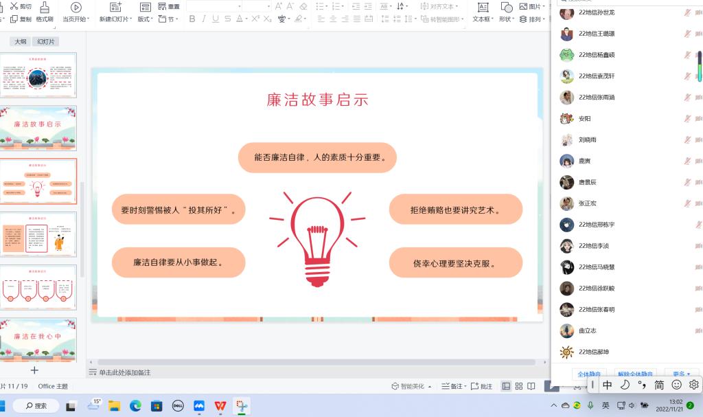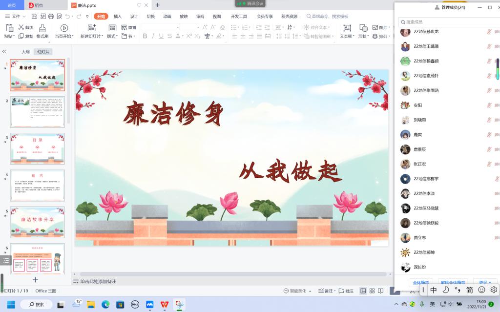 为培养同学们清正廉洁的道德观念,树立廉洁自律风气,弘扬校园正能量,引领社会廉洁风尚,11月19日,申博sunbet各班以线上的方式在腾讯会议召开了“廉洁修身,从我做起”主题团日班会。