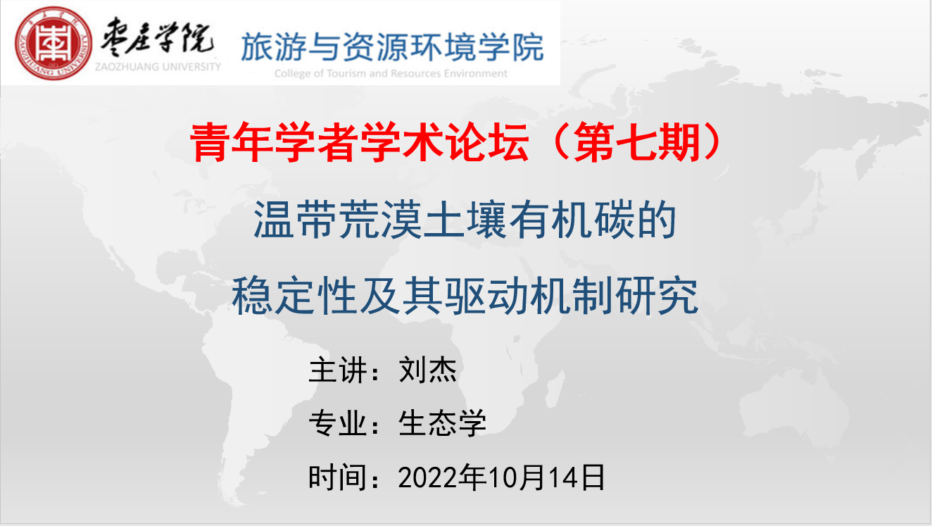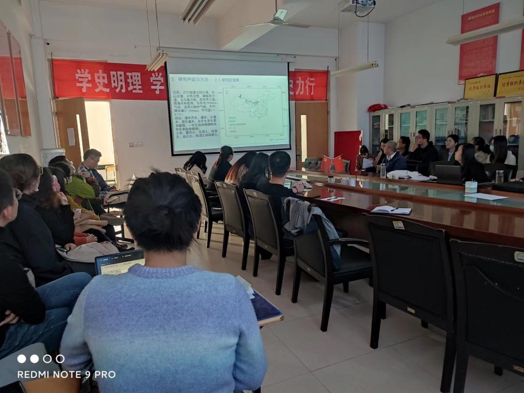 报告会上,刘杰博士做了题为“温带荒漠土壤有机碳的稳定性及其驱动机制研究”的学术报告,揭示了中国温带荒漠土壤有机碳的物理、化学和生物稳定性特征,并探寻了其维持机制。研究发现:30-50cm土层土壤有机碳的物理与生物稳定性均高于0-5cm土层。同一土层,C4植物为主的沙质荒漠、草原荒漠和高寒荒漠土壤有机碳的化学、生物稳定性高,戈壁荒漠低。0-5cm和5-10cm土层,草原荒漠与高寒荒漠土壤有机碳的物理稳定性高于其他荒漠,而30-50cm土层呈现相反的规律。年均降水量与年均温,生物结皮的发育,灌木根系的分布,土壤微生物生物量等因素是土壤有机碳稳定性的主要影响因素,其相对贡献的不同是土壤有机碳稳定性差异的主要原因。本研究为深刻理解温带荒漠区土壤有机碳的稳定性及其驱动机制提供了理论基础与科学依据。刘杰博士的报告内容丰富,循序渐进,展示了多年来开展的大量野外、室内研究工作和研究结果。学术报告后,与会老师就相关研究方法与研究内容等与刘杰博士进行了交流。