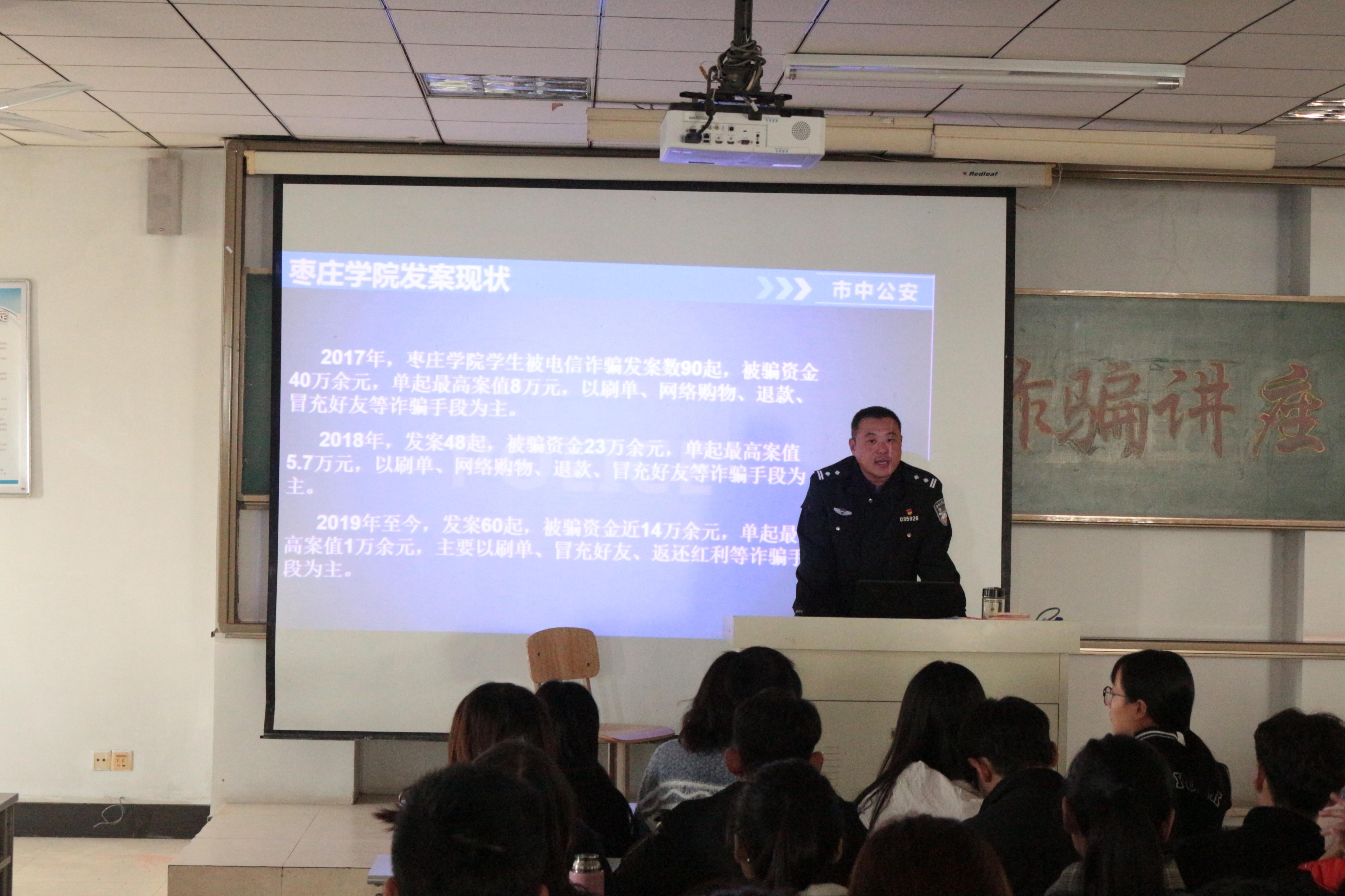 12月4日下午,申博sunbet在理工楼2505教室开展防诈骗安全教育讲座。本次讲座由渴口派出所刘鹏教导员主讲,200多名员工聆听了讲座。