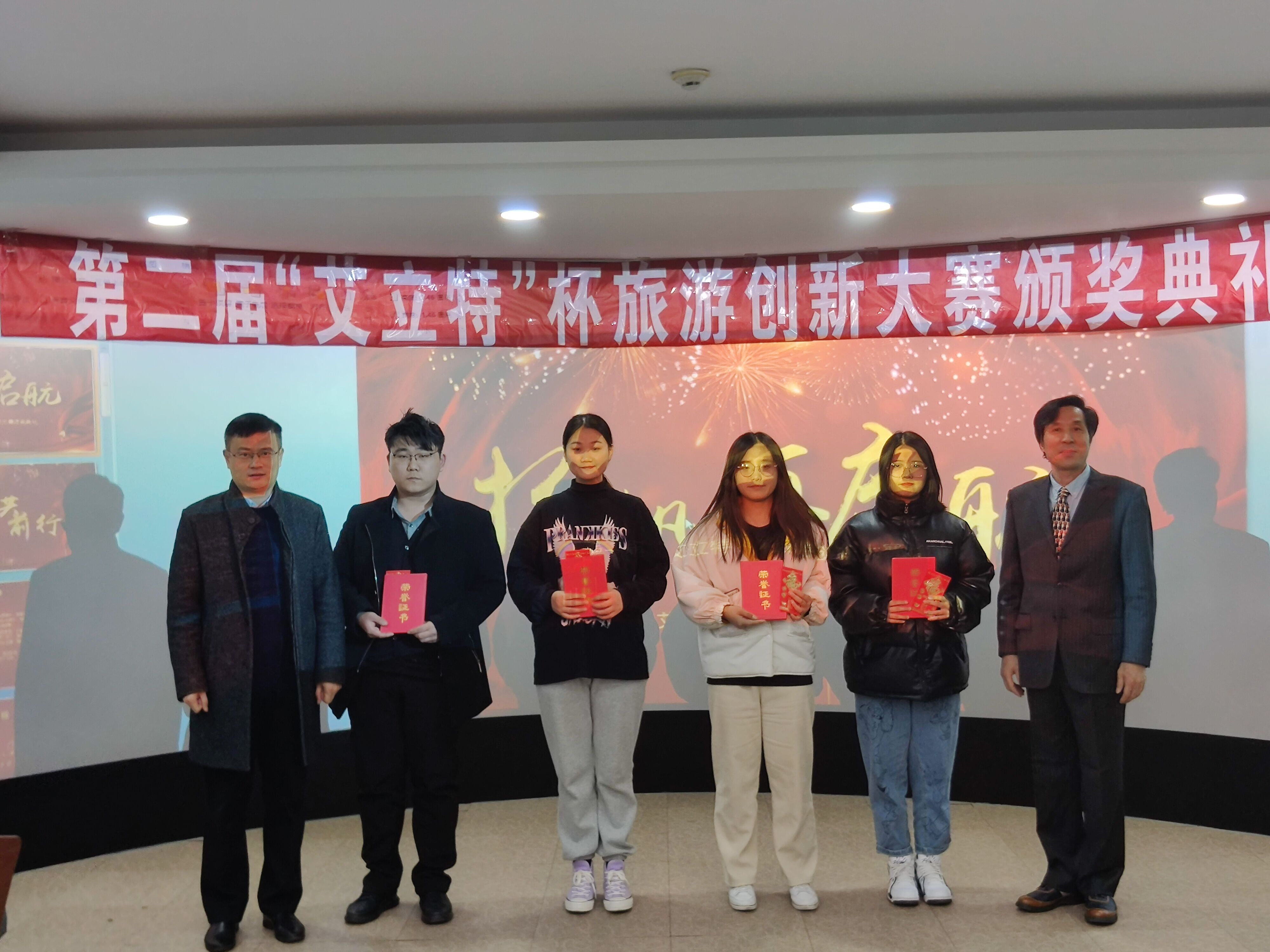 谢龙飞代表企业致辞,希望同学们通过旅游创新大赛锻炼动手能力和独立思考能力,拓宽眼界和思路。本次大赛旨在发掘优秀的旅游产品创意人才,让创意找到市场,让企业发现商机,从而更加有效地搭建高校、企业之间的长效合作平台。共80多名同学参加此次比赛,历经近十个月激烈角逐,共有23项作品获奖,颁发奖金共计1.18万元,奖金均由北京艾立特教育有限公司赞助。