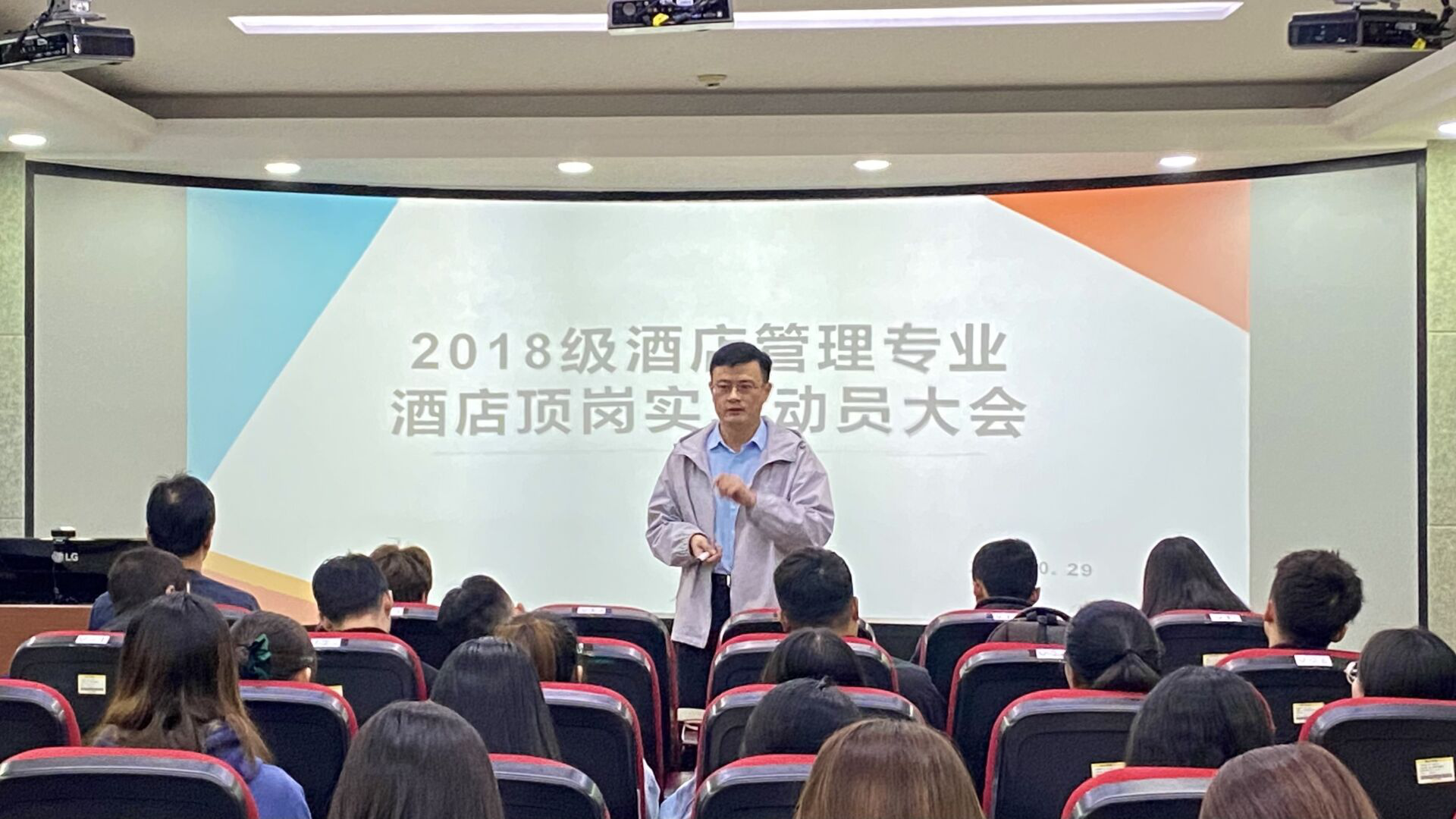 顶岗实习是应用型创新型人才培养体系中重要的教学环节,旨在提高老员工实践能力和创新能力,强化员工职业综合素养。为确保员工顶岗实习工作顺利开展,提高其对新环境、新岗位的适应能力,使同学们明确顶岗实习的重要性,10月29日下午申博sunbet在综合楼导游实训室召开2018级酒店管理专业顶岗实习动员会。申博sunbet部分教师、2018级酒店管理专业的辅导员及全体员工参加了此次会议,会议由专业负责人王文杰主持。
