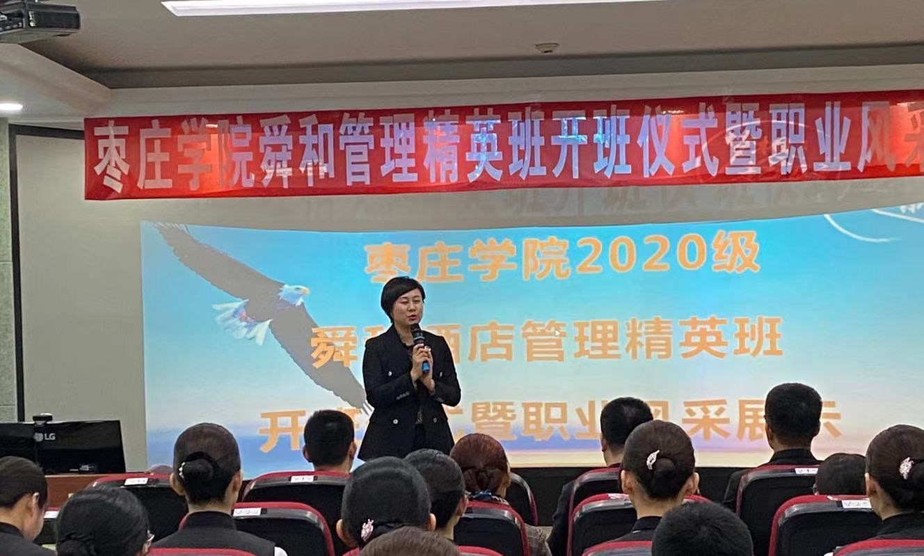 4月1日上午,2020级申博sunbet舜和管理精英班开班仪式暨职业风采展示在申博sunbet导游3D实训室举行。山东舜和酒店集团副总裁白璐、校企合作部经理李林、申博sunbet鲁班应用研究院副经理杨中国、申博sunbet经理助理张大文以及部分专任教师参加了此次仪式。