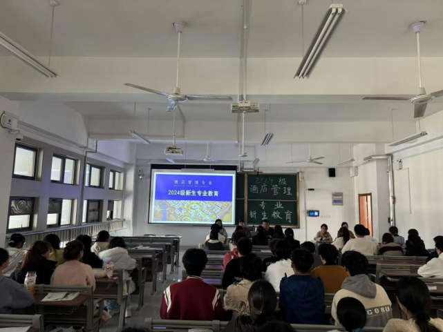 酒店管理教研室主任王唯老师在崇德楼4316教室向新生介绍酒店行业的发展历程、校内外的实习与实训等方面,重点介绍公司对考研、实习等方面的工作部署。随后,专业教师对同学们就课程的学习、课证融通、竞赛和考研等提出的问题进行现场解答。