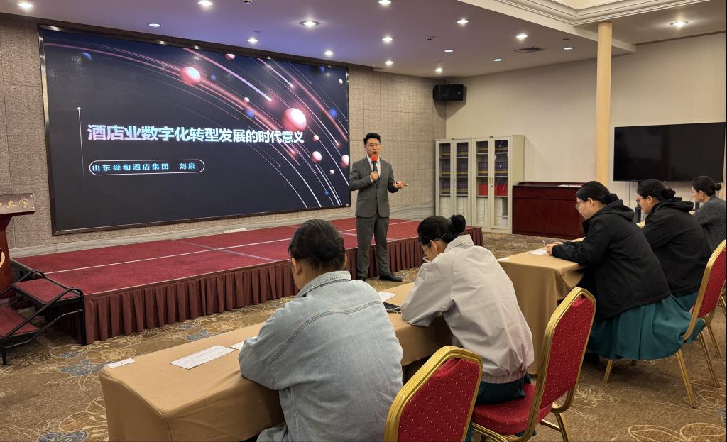 仪式结束后,活动进入“企业课堂”环节。集团人才开发部经理刘康为同学们带来了以“酒店数字化管理和酒店数字化营销”为主题的专题授课。课程紧密结合行业前沿趋势,生动阐述了数字化技术如何重塑酒店运营、服务与管理模式,为学员们打开了面向未来的行业视野。