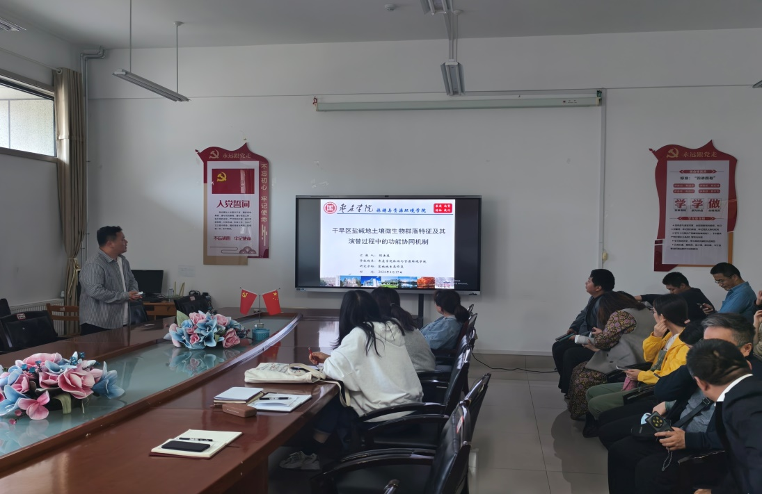 在报告会上,阴法庭博士就“干旱区盐碱地土壤微生物群落特征及其演替过程中的功能协同机制”进行了学术报告。阴法庭博士研究表明我国不同生态区盐碱地土壤细菌群落的优势物种具有跨区域的相似性,群落差异主要集中在非优势类群。盐碱弃耕地复垦为农田后的时间序列过程中,细菌群落主导了土壤微生物群落的演替,确定性过程和随机性过程共同影响了盐碱弃耕地复垦后土壤微生物群落的构建,土壤微生物群落网络中物种间的协作能力更强,网络结构趋于简单的同时更加稳定。在土壤微生物群落演替过程中,优势物种主导了功能基因的组成,功能基因的协同效应维持了优势物种的生态位优势。阴法庭博士与相关教师就盐碱地土壤微生物群落的时空演替规律、组装策略和生态功能进行了深入交流与讨论。