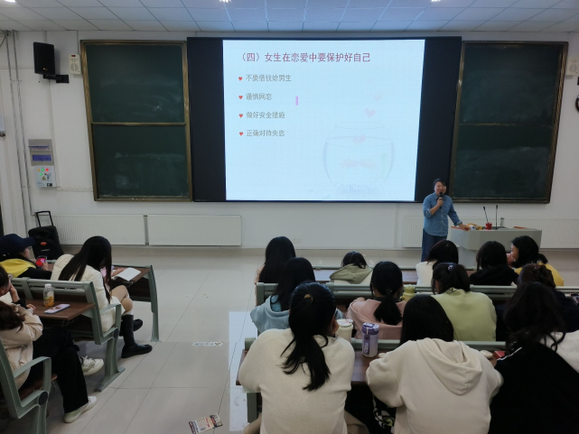 邵园园从“爱情到底是什么”“爱情需要什么”和“怎样去达到一个较好的爱情状态”三个问题展开论述,诠释爱情的真谛,帮助同学们提升爱与被爱的能力。随后,邵园园结合具体实例,聚焦当下女老员工在恋爱过程中常遭遇的心理挑战和安全问题,引导同学们正确认识自身情感需求,学会理性处理恋爱矛盾,并强调在恋爱观上应注重道德修养和精神追求,确保恋爱关系的纯洁、稳定与高尚。同时,邵园园围绕出行、住宿、兼职等多个方面指出并分析女生在安全防范中存在的不足以及应对方法,有助于加强同学们的安全防范意识、提高其风险应变能力。最后,邵园园指出“爱情不是生活的全部,爱自己才是终身浪漫的开始”,希望同学们在大学期间正确处理好恋爱、学习与生活的关系,塑造更好的自己。