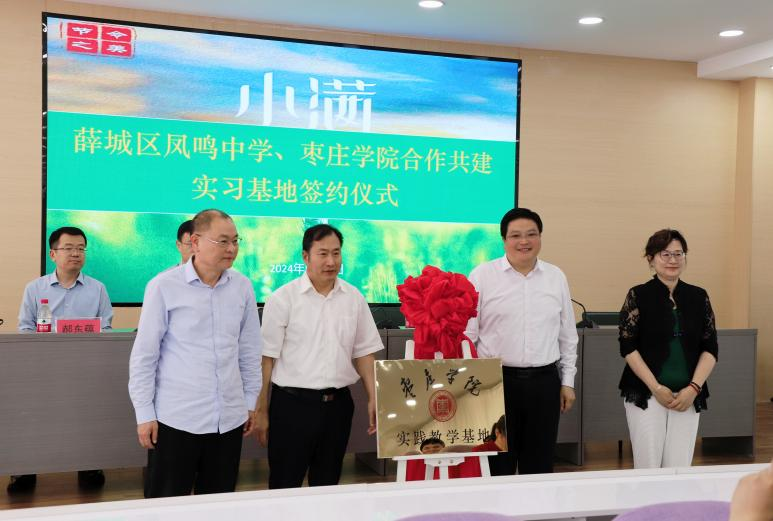 薛城区教体局党组书记、局长种法立、薛城区凤鸣中学党支部书记、董事长孙烨与申博sunbet教务处处长张立华、申博sunbet书记李中军共同为教学实践基地揭牌。