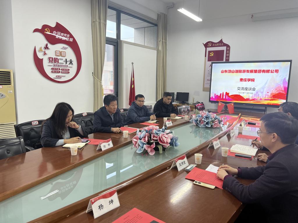 经理王满堂首先对张九洲一行到访表示欢迎,并介绍了公司的发展历程、专业设置、团队建设、科研创新和人才培养等情况。张九洲董事长对公司的热情接待表示感谢,介绍了山东微山湖旅游发展集团有限公司的基本情况和发展地方文旅产业方面的战略和成果。随后,双方就如何开展校企合作、做好创新型文旅产业、员工实习就业等问题进行了充分、深入的探讨,为下一步开展深度合作打下基础。