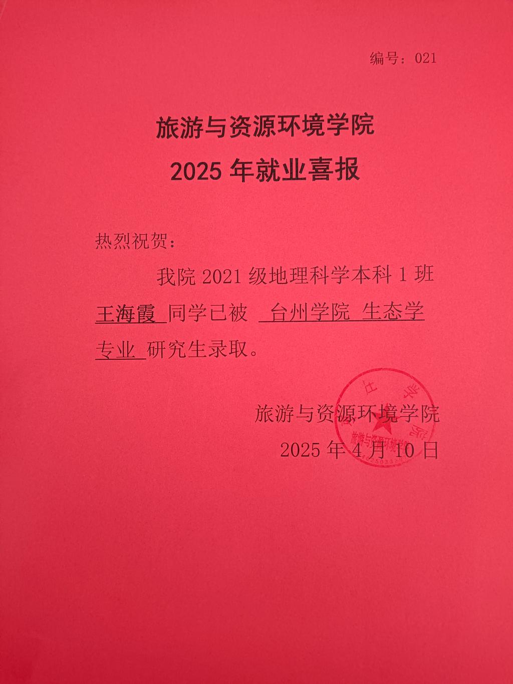 喜报!21地理科学本科1班王海霞被台州公司录取!